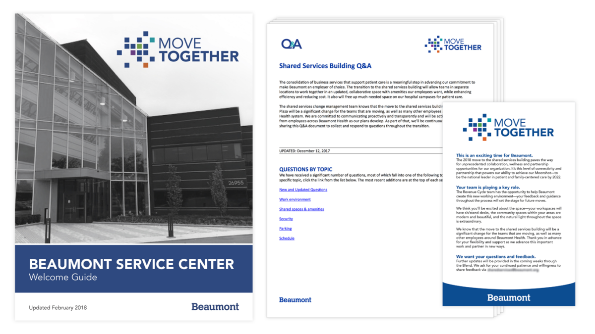 Consistent change communication is essential to advancing a move of this scale. Campaign-branded tools, including a dynamic Q&A and welcome guide, were developed and maintained to clarify questions and create excitement.